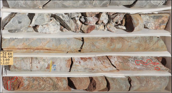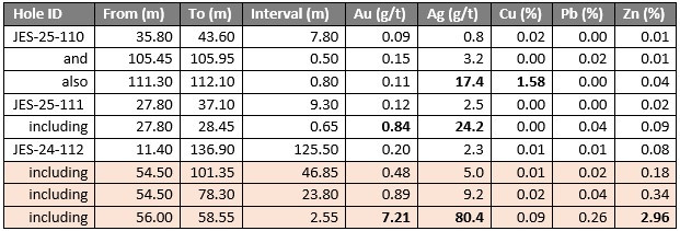 Photo 1. Core Photo of quartz veining from hole JES-25-112, 56.0 to 58.55 returned 7.2 g/t Au, 80.4 g/t Ag and 2.96% Zn.