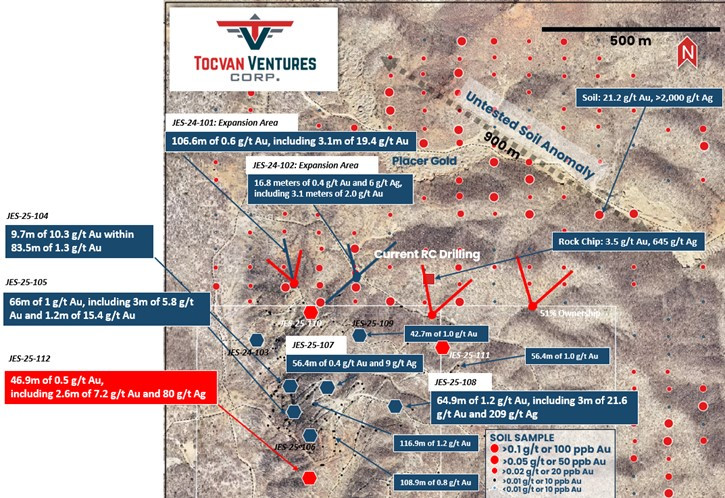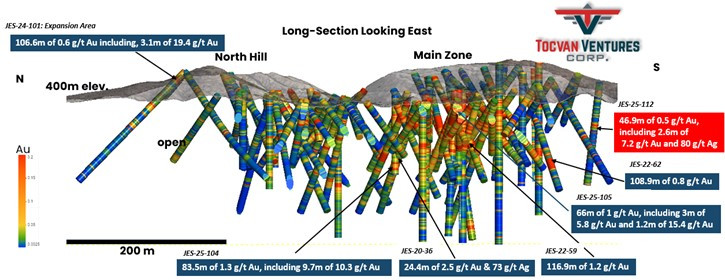 CALGARY, AB / ACCESS Newswire / April 16, 2025 / Tocvan Ventures Corp. (the "Company") (CSE:TOC)(OTCQB:TCVNF)(WKN:TV3/A2PE64), is pleased to announce the remaining results from core drilling at the Gran Pilar Gold Silver Project in mine-friendly Sonora, Mexico. Ten core drillholes totaling 1,167.5 meters were completed earlier this year within the majority owned (51%) Main Zone held in partnership with Colibri Resource Corp. Today's results are highlighted by 7.2 g/t Au and 80 g/t Ag over 2.6 meters, within a mineralized zone that averages 0.5 g/t Au over 46.9 meters starting from 54.5 meters downhole (drillhole JES-25-112). Drill hole JES-25-112 is located 70 meters south of past drill hole JES-22-62, which returned 108.9 meters of 0.8 g/t Au (see April 26, 2022 News Release). Mineralization is hosted in a stockwork of quartz veining, with high grade zones associated with shear zones with quartz andiron oxides filling fractures. JES-25-112 marks the southern most successful hit of significant mineralization to date, the trend remains open to the south. A core duplicate sample through the high-grade zone returned 18 g/t Au over 1.1 meters, the original sample returned 4.4 g/t Au. The variance has been noted as a product of coarse gold in the system. The Company is evaluating additional studies to determine the impact of high-grade variance on resource estimation. Hole JES-25-111, located 450 meters northeast of the Main Zone, within the 4-T Trend returned an anomalous zone of gold and silver that included 0.7 meters of 0.8 g/t Au and 24 g/t Ag. Hole JES-25-110 located 300 meters from the Main Zone, within the North Hill Trend returned an anomalous zone that includes 7.8 meters of 0.1 g/t Au. Intervals reported are drilled widths, true estimated widths are not known at this time.