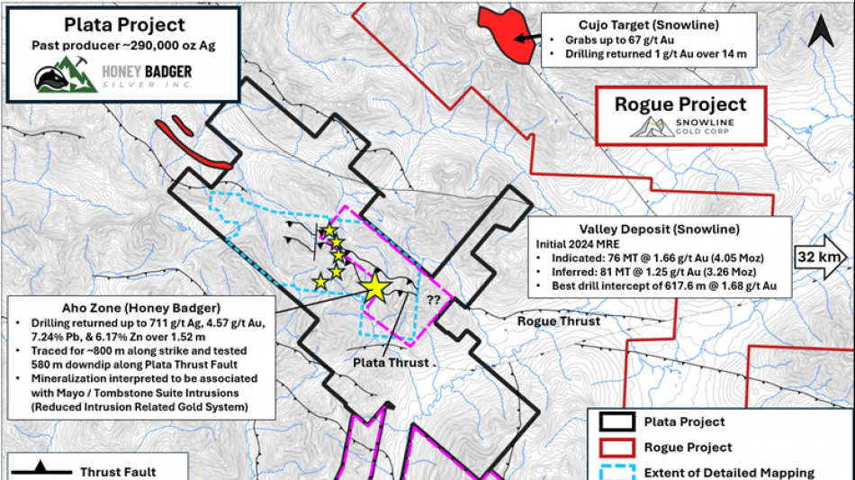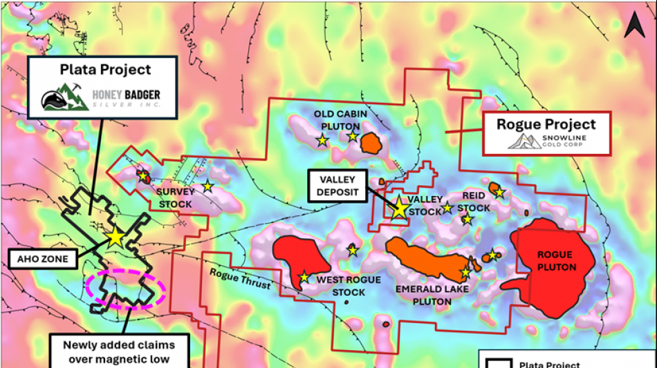 WHITE ROCK, BC / ACCESS Newswire / April 16, 2025 / Honey Badger Silver Inc. (TSXV:TUF)(OTCQB:HBEIF) ("Honey Badger" or the "Company") is pleased to provide an update on its 100%-owned Plata project, located adjacent to Snowline Gold Corp's ("Snowline") major discovery at its Rogue project in the Yukon Territory. The Company has been prioritizing targets to plan the next phase of work on the project.