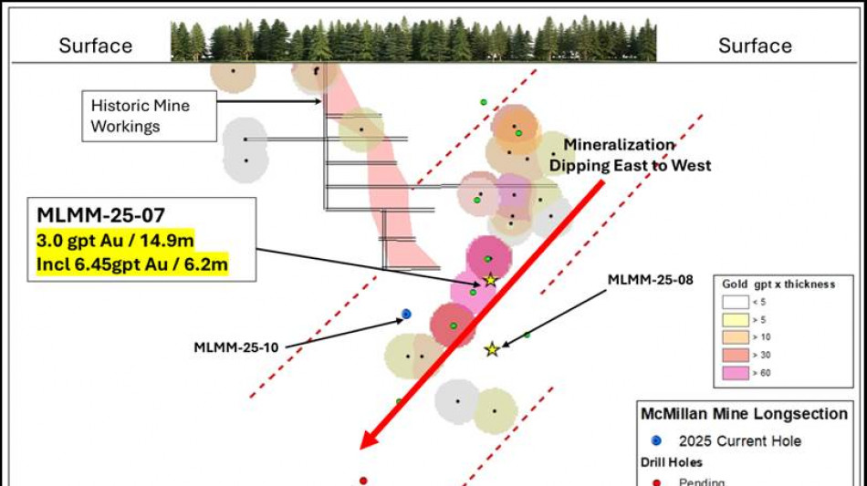 Recent drilling (Hole MLMM-25-09) intersects five zones of mineralization including occurrences of visible gold confirming western plunge of mineralization below the McMillan Mine.