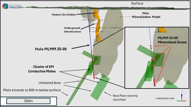 With other priority targets planned in the current drilling campaign, hole MLMM-25-09 was stopped at a final length of 570 m. At the time of stopping the hole, sulphide stockwork was still appearing at the bottom of the hole and presents an opportunity for additional exploration. McFarlane plans to complete a borehole "EM" survey on this hole to identify additional targets around this newly identified mineralized EM conductive zone.