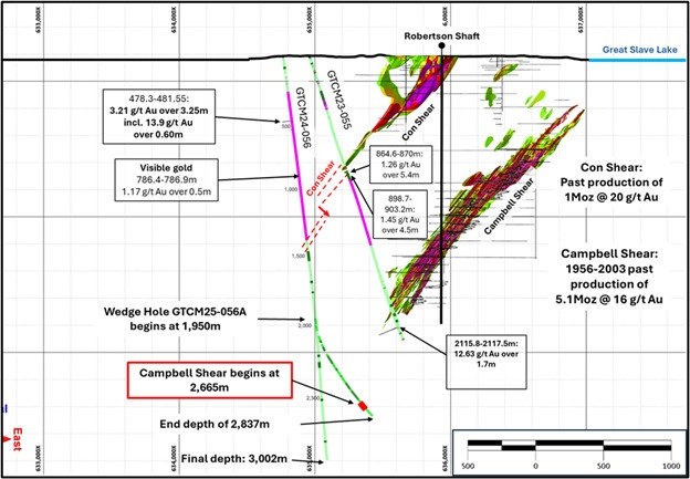 The objective of the 2025 wedge hole drilling program is to continue testing for high-grade gold in the CS ( past production of 5.1 Moz @ 16 g/t, refer to the Oct. 21, 2022 Technical Report) on the Con Mine below the historic Con Mine underground workings. The Con Mine Option (CMO) property is under option from a subsidiary of Newmont Corporation and is 100% acquirable by the Company upon fulfillment of certain conditions set out in the CMO property option agreement, as reported in the Company's news release dated November 22, 2021. The target is located downdip from the 5.1 Moz mined gold deposit plunging steeply to the south between elevation 1,900 metres (historic Robertson shaft depth) and 2,600 metres.