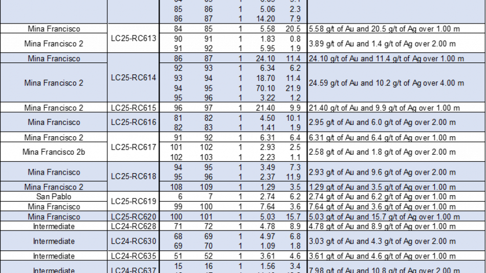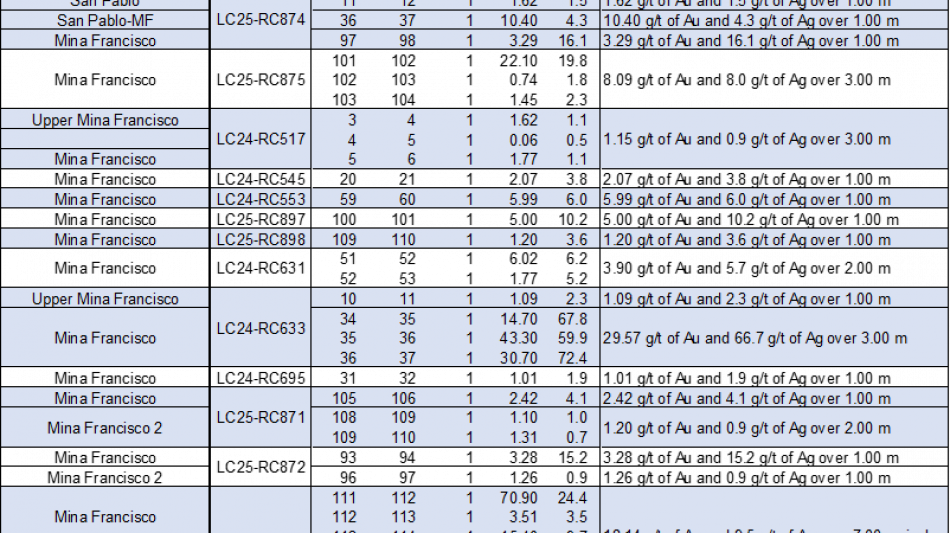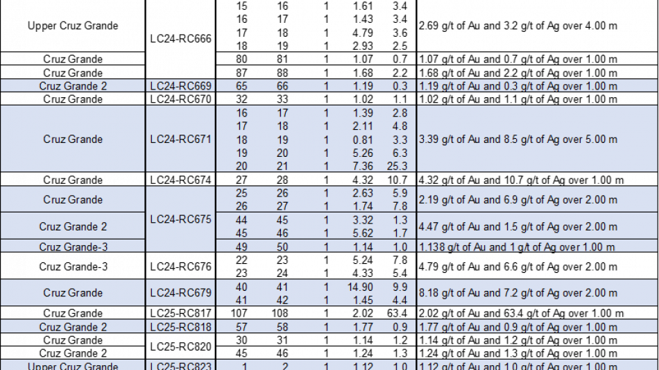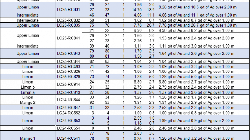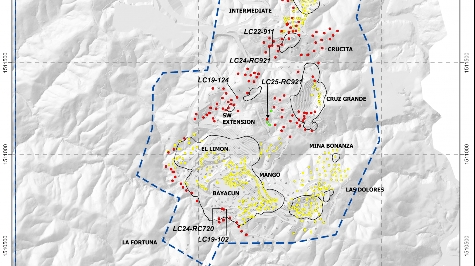 Drill hole LC25-RC921 intersected 117.98 g/t Au and 37.0 g/t Ag over 2.0 m (1.7 m ETW), 103 m below surface, and confirmed an 87 m up-dip extension of the gold vein intersected by diamond drill hole LC19-124 (see press release dated January 6, 2020). LC19-124 intersected two intervals representing the El Limon Zone of 8.68 g/t Au and 24.9 g/t Ag over 0.8 m and 26.8 g/t Au and 50.1 g/t Ag over 0.7 m, respectively. The second interval intersected mineralization at a vertical depth of 155 meters.