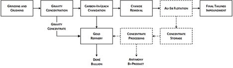 Depicted in the simplified process schematic, the hybrid process involves conventional technology, with a focus on maximizing Au recovery to doré bullion, while enabling the potential for bi-product recovery of Sb values from secondary treatment of an Au-Sb concentrate.
