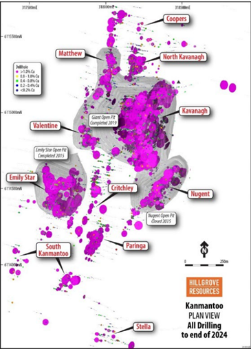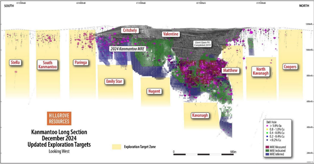 Various exploration targets have been identified, including but not limited to Emily Star, North Kavanagh, Matthew, Valentines, Paringa, Critchley and Coopers. On April 22, 2025, Hillgrove announced that it had identified new mineralisation at the Valentine zone, below the Valentine Open Pit, approximately 180m below previously mined areas, and 300m away from existing underground infrastructure, confirming the potential for new copper mineralization within the existing mining lease. A third diamond drill rig has also been mobilized, expected to accelerate exploration and resource expansion at Kanmantoo, as part of Hillgrove's 60,000m drilling program.