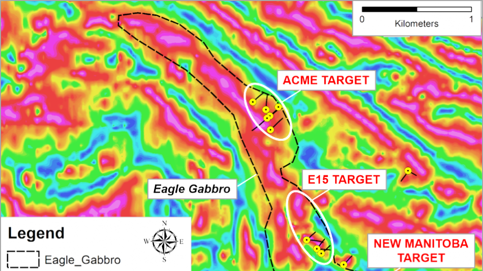 A total of 4,132 metres were drilled in 25 holes during the Q4 2024 drill program at the Eagle gabbro (Figure 1). Three discrete targets were tested along a ~2 km segment of the Eagle gabbro. These included 11 holes targeting the historical New Manitoba deposit in the south (holes EAG24-01 to 11); 4 holes at a linear magnetic anomaly located ~500m north of the New Manitoba deposit ('E15' target; holes EAG24-13, 14, 16 and 17); and 6 holes at a previously untested disseminated sulfide occurrence at the Acme target area, located 1.2 km north of E15 (holes EAG24-20-25). Two holes were drilled on a conductor (EAG24-016) and a flanking magnetic anomaly (EAG24-17) located ~1 km east of the Eagle gabbro. One hole tested an unmapped magnetic anomaly located along the east side of the Eagle gabbro (EAG24-12). One hole was abandoned (EAG24-15).