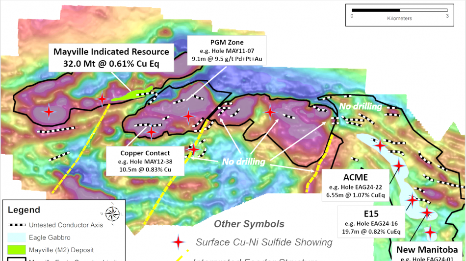 1 The Mayville deposit is located ~10 km to the west of the Eagle gabbro and is estimated to contain 32.0 million tonnes of indicated resources averaging 0.40% Cu and 0.16% Ni (see the Company's May 6, 2024 news release for details)