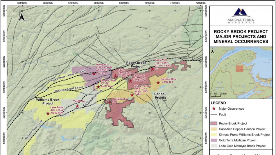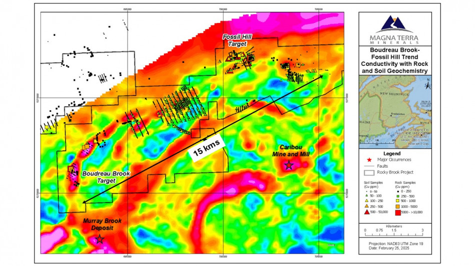 TORONTO, ON / ACCESS Newswire / May 22, 2025 / Magna Terra Minerals Inc. (the "Company" or "Magna Terra") (TSXV:MTT) is pleased to announce that it has initiated a first phase exploration program on its recently acquired Rocky Brook Project ("Rocky Brook" or the "Project"), located in the prolific Bathurst Mining Camp of northern New Brunswick (Figure 1). Ongoing digital compilation of historical exploration data has resulted in the identification of the Boudreau Brook Trend - a 15 kilometre long zone of coincident airborne electromagnetic conductivity and anomalous Cu-Zn-Co rock and soil samples. The Boudreau Brook Trend includes other known occurrences at the Boudreau Brook and Fossil Hill targets, where previous rock grab sampling* has returned 3% Cu and 16.65% Cu and 0.64% Co, respectively as well as highlighting several other coincident geochemical and geophysical targets (Figure 2). Exploration has been initiated on the Project and is currently focused on the collection of ~2,000 B-horizon soil samples, and systematic prospecting and geological mapping over and adjacent to priority targets along the Boudreau Brook Trend.