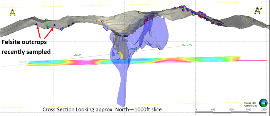 Figure 1: Cross-section A-A′ (looking approximately north) showing the drilled Colosseum breccia pipe (blue volume) cantered within a pronounced gravity low (light blue colour) and recently sampled felsite dykes (red arrows) to the west also sit in gravity lows.