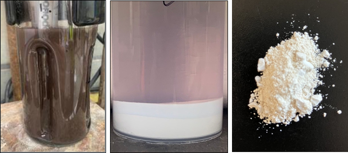 The next step in the purification process is the hydrolysis stage, which involves the heating of the liquor, thus breaking down the titanyl sulphate and resulting in the production of hydrated TiO2 and the recovery of H2SO4. This step was carried out in two stages without seed TiO2 material, an improvement from previous work. The solution was heated to 106 degrees C and held at temperature whilst being stirred for 2 hours. The resulting slurry was then centrifuged to separate the liquor from the precipitated solids. Finally, as part of the product finishing stage, the hydrated TiO2 was separated from the liquor using a centrifuge, and the solids were then calcined to remove water and produce a high-purity TiO2 compound (see figure 3).