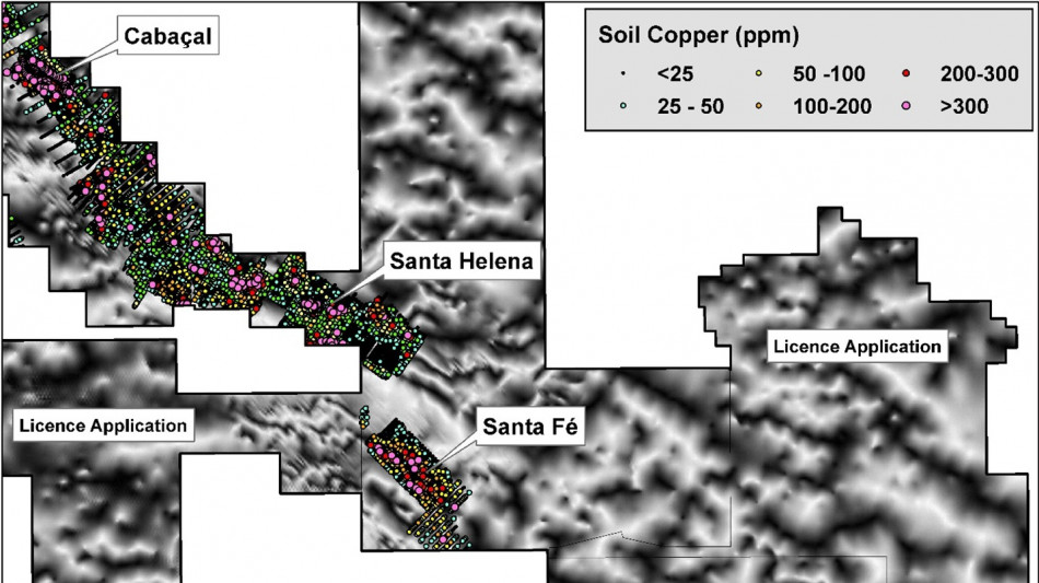 The Company is also reporting, that due to strong extensions of geochemical and coincident geophysical anomalies at Santa Fé, it is expanding the active exploration programs there. Drill programs at Cabaçal, Santa Helena and Santa Fé continue with results pending.