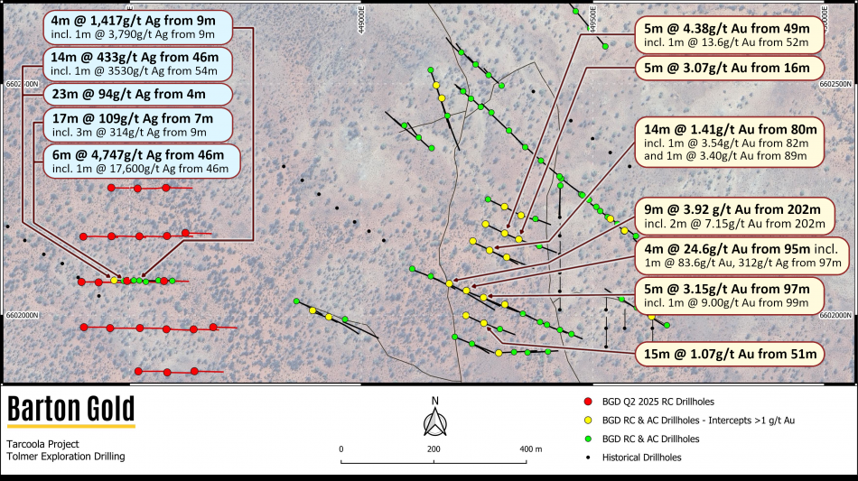 ADELAIDE, AUSTRALIA / ACCESS Newswire / June 15, 2025 / Barton Gold Holdings Limited (ASX:BGD)(FRA:BGD3)(OTCQB:BGDFF) (Barton or Company) is pleased to confirm that expanded RC drilling has completed at its recent 'Tolmer' high grade silver discovery, located at the Company's South Australian Tarcoola Gold Project (Tarcoola).1 A total of 2,882m RC drilling was completed across 21 completed holes to an average depth of 137m. Samples are planned to depart site during the coming week, with the first multi-element assay results expected toward the end of July.