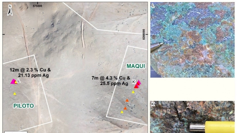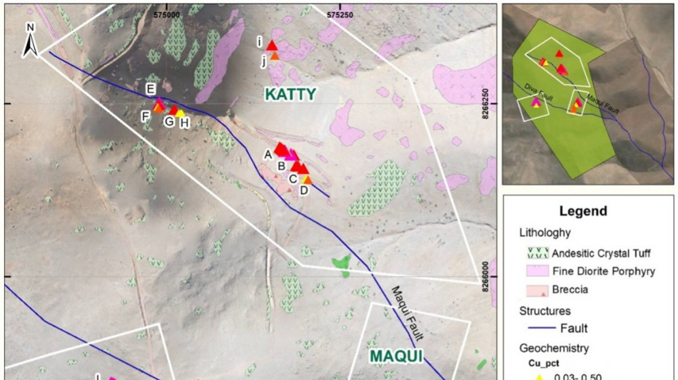 Detailed geological mapping at a scale of 1:2000 within the Katty target has resulted in the discovery of new zones with copper oxide mineralization and the assignment of new high-value targets such as Maqui, Piloto, and Katty (Figure 3). Exploration activities have been focused on the mapping and sampling of copper oxides throughout the Diva Trend and secondary faults to it in the Maqui Fault. The mineralization style is Cu-Ag in the form of mantos hosted in dioritic porphyry (intrusive rock) in contact with andesitic crystalline tuff (volcanic rock) and consists of copper oxides such as malachite, chrysocolla, atacamite, and copper wad accompanied by sulfides such as chalcopyrite, bornite and pyrite which is structurally controlled by the Maqui and Diva faults.
