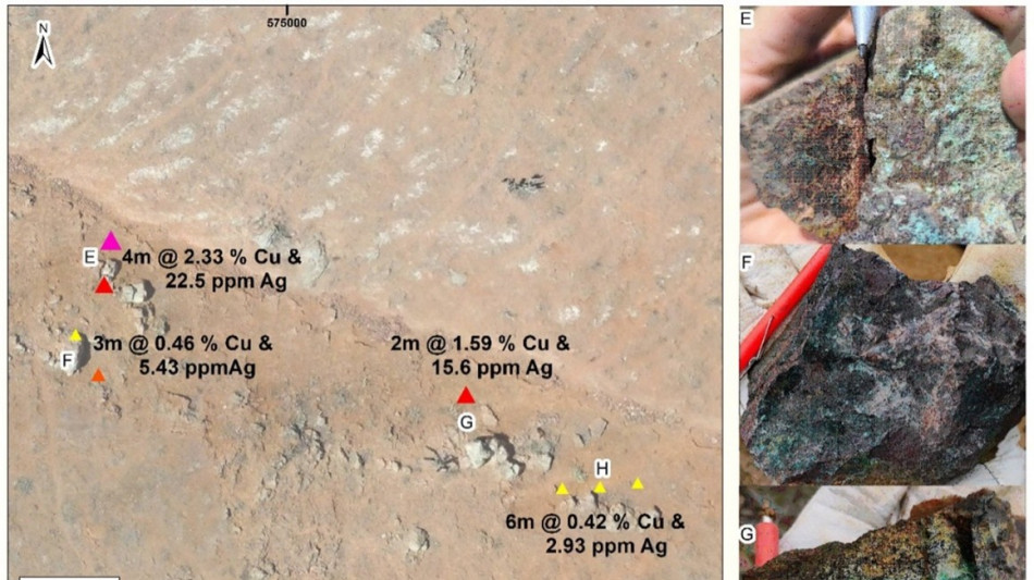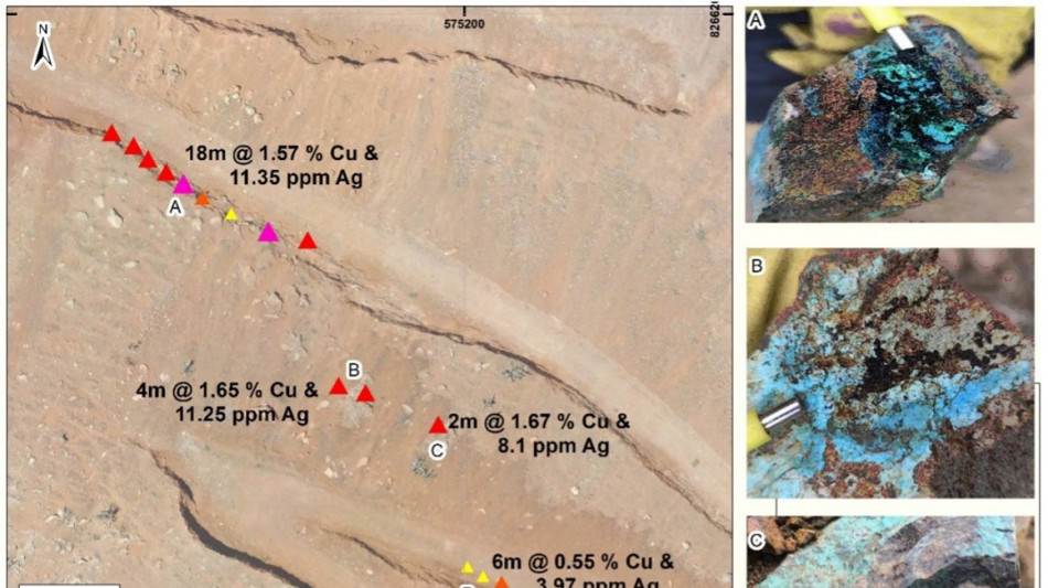 The photographs show high-grade 2% to 4% copper oxides and sulfides such as bornite.