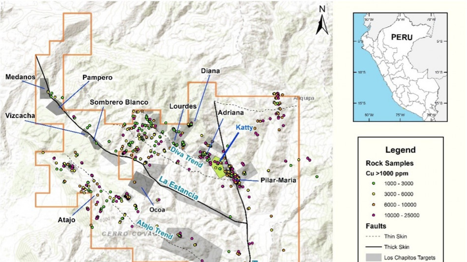 "The recent channel results with copper grades as high as 2 to 4% copper and associated silver mineralization over significant intervals, are some of our best channel samples at Los Chapitos in a new area about 1 km south of our main Adriana zone of copper mineralization," commented Jay Chmelauskas, CEO of Camino. "Katty is an area with insights developed over the past year by our partner Nittetsu and our Peru geological team and consultants, we are now able to re-evaluate the potential with a fresh perspective to connect and grow copper mineralization in this area. Over the next 6 months, Camino remains active with exploration drilling in Peru, while we advance our Puquios copper mine development in Chile."