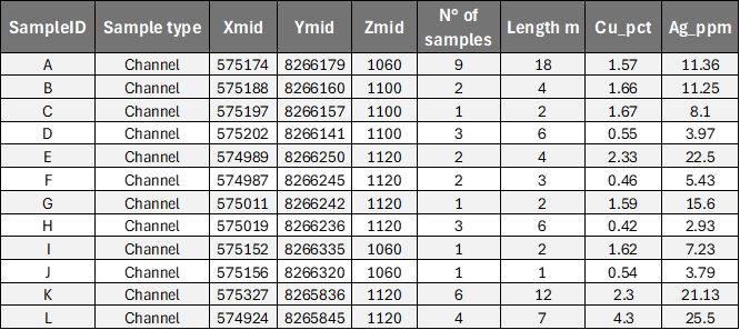 The Camino geology team believes this mineralization could extend beyond the outcrop area, beneath the ground cover. To evaluate this possibility, a total of 42 samples were collected across 12 channels (Figure 3 and Table 1). All results yielded grades greater than 0.3% copper, reinforcing the potential of this area as a significant source of surface and near-surface mineralization.
