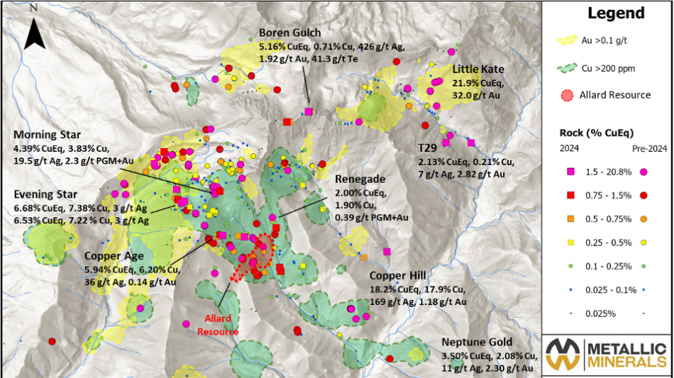 The drill-ready Evening Star target returned some of the highest-grade surface rock samples which included 6.68% Cu Eq (7.38% Cu and 3.0 g/t Ag), and 6.53% Cu Eq (7.22% Cu and 3.0 g/t Ag). The Copper Age North target close to the current Allard resource, returned 5.94% Cu Eq (6.2% Cu, 36.0 g/t Ag and 0.24 g/t combined Au+PGEs (0.14 g/t Au, 0.03 g/t Pt, 0.06 g/t Pd).