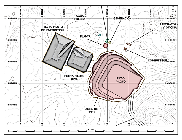 Figure 1. Layout of the Pilot Design and Infrastructure. The Pilot facility is located on 100% controlled ground, 500 meters north of the Main Zone. The strategic location allows for sufficient area for growth and expansion for later project development.