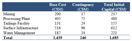The major components of pre-production capital are estimated at C$1,685M, including a contingency of C$246M. These costs are summarized in Table 3. Infrastructure costs include C$84M (before contingency) for upgrades to the government-maintained North Canol Road and a new bridge over the Pelly River near the existing highway connection at Ross River. The total construction period, including construction of year-round road access to site, is estimated to be 3.5 years.