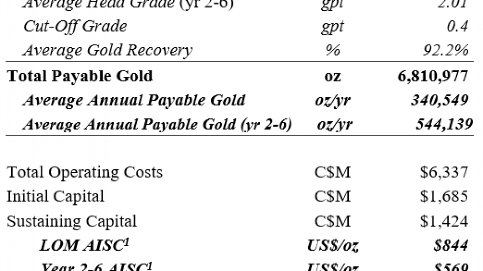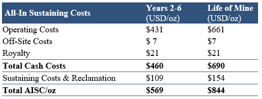 AISC, which include operating costs, off-site costs, a 1% net smelter royalty ("NSR"), sustaining capital costs and progressive reclamation costs, are presented in USD. Using the US$2,150/oz study price, AISC average is US$844/oz produced LOM (6.8 Moz produced), including US$569/oz produced during the first five full years of operation (2.7 Moz produced).