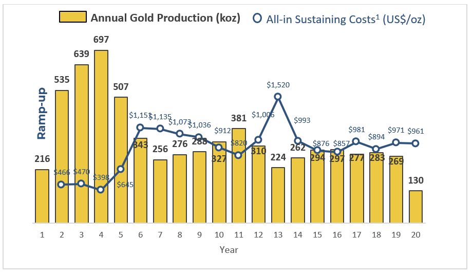 Significant production and high margins: 544koz annual average Au production at all in sustaining costs ("AISC")1 of US$569/oz2 Au for the first five full years of production