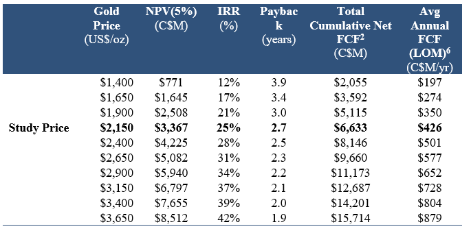 Robust economics: C$3.37 billion post-tax net present value at a 5% discount rate ("NPV5%") at US$2,150/oz Au, increasing to C$6.80 billion at US$3,150/oz Au3,