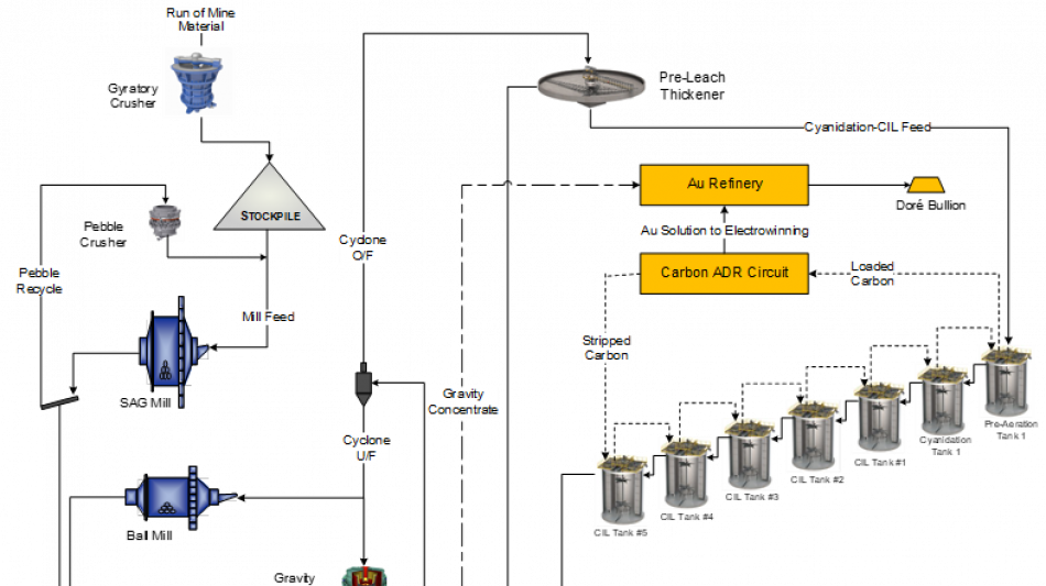 The PEA envisions a 25,000 tonne-per-day processing facility based on a standard metallurgical flowsheet, consisting of grinding, gravity separation and carbon-in-leach (CIL) followed by cyanide (CN) detox to produce gold doré (Figure 3). No heap leaching will be used in the project. Metallurgical testing indicates clean, non-refractory gold mineralization. Average gold recovery is estimated at 92.2% for the PEA.