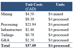 Operating costs are anticipated to average C$37.09/tonne processed, as outlined below in Table 4. Costs were estimated using industry benchmarking to comparable projects, as well as PEA level estimates of the key consumables, such as diesel consumption, reagents and power.