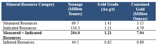 The PEA is based on the MRE, which comprises 7.94 million ounces of gold averaging 1.21 g/t Au in the measured and indicated categories and an additional 0.89 million ounces gold averaging 0.62 g/t Au in the inferred category, based on roughly 53 km of drilling completed by the end of 2024. Note that the PEA production profile is based on a subset of the MRE (revenue factor 0.875 used for PEA vs. 1.0 used for MRE), and uses a higher cut-off grade (0.4 g/t Au PEA vs. 0.3 g/t Au MRE) on account of a lower gold price used in PEA pit design and processing (US$1,950/oz PEA engineering vs. US$2,350/oz MRE).