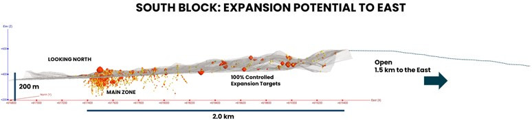 Figure 2. Target 3D map of the South Block area where drilling continues to expand resource potential. Undrilled target areas extend a kilometer north and 1.5 kilometers to the east with additional area to expand.