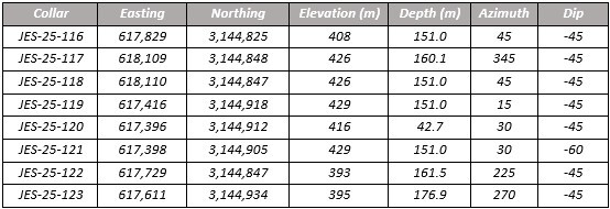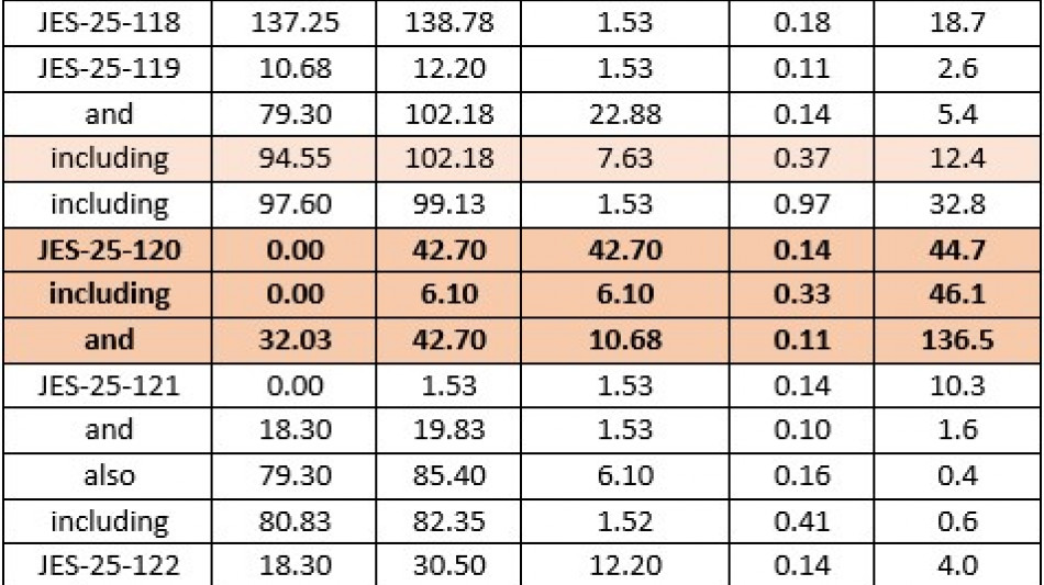 JES-25-119: 22.9 meters of 0.14 g/t Au and 5.4 g/t Ag, including 7.6 meters of 0.37 g/t Au and 12.4 g/t Ag, with a high-grade subinterval of 1.5 meters of 0.97 g/t Au and 32.8 g/t Ag.