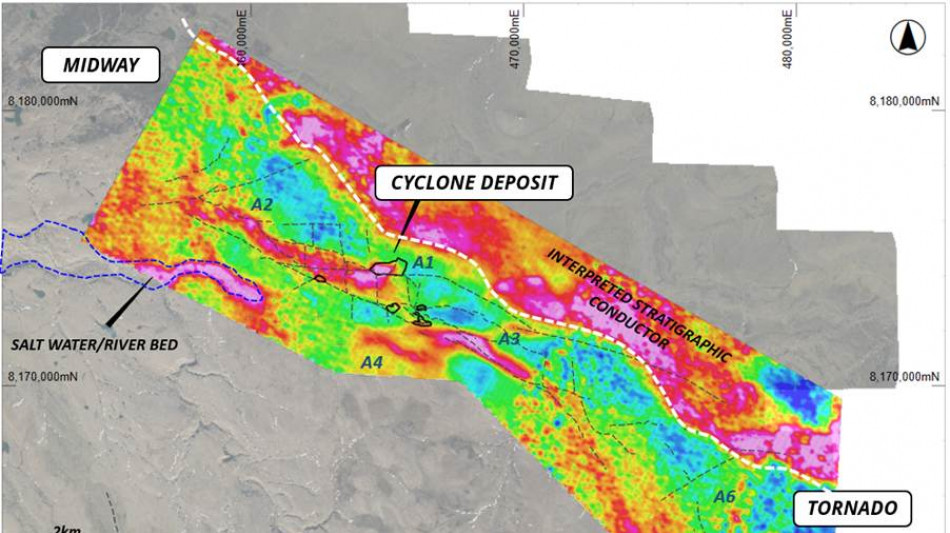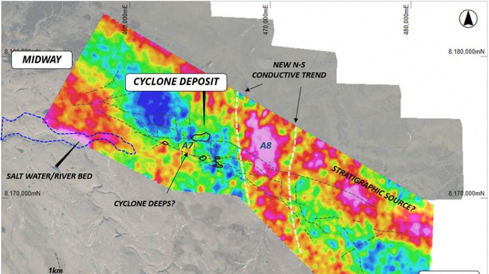 Interpretation of the preliminary higher frequency data (interpreted Figure 4). One of these anomalies is spatially related to known high-grade copper sulfides at the Cyclone Deposit, confirming the geophysical technique's ability to image this style of mineralization.
