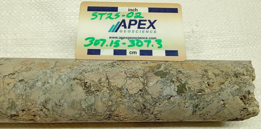Figure 3: Dense breccia and fracture fill visual pyrite and chalcopyrite from ST25-02 (307.15-307.3m downhole). Assays for this interval are pending (see below visual estimates disclaimer).