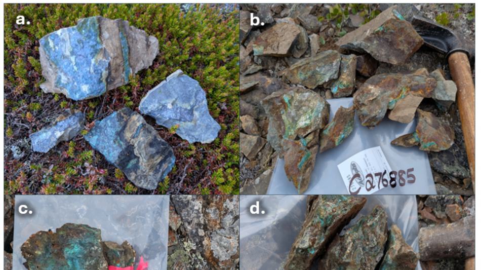 Figure 1: Copper mineralization in surface grab samples from two of several newly-discovered copper showings at Epworth: a. chalcocite (metallic grey) veins in dolomite (buff-brown), b. siltstone with disseminated zones of chalcopyrite, malachite and azurite, c. shale with chalcopyrite, chalcocite, bornite, malachite and azurite, d. shale with chalcocite and malachite. See Figure 2 for the sample locations, with 'a' corresponding to the northern location and 'b-d' corresponding to the southern location. Mapping and sampling are ongoing.