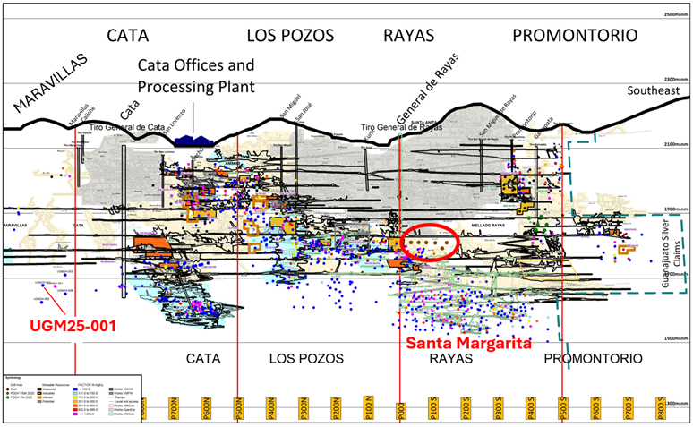 A drilling program was completed at the Maravillas zone which tested for new vein shoots; this area of VMC has historically seen very limited exploration. UGM25-001, which targeted the Veta Madre, intersected a wide vein intercept with a true width of 7.06 metres. (See Guanajuato Silver news release dated November 20, 2024 titled "Guanajuato Silver Drills 3.19m of 492 g/t AgEq* at Valenciana Mines Complex"). Results for UGM25-001 showed a zone of moderately mineralized material; additional drilling in this area will look to expand the known vein footprint and seek to determine if other high-grade mineralized shoots are located within this portion of the vein system.