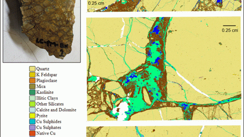 Figure 4. Automated Material Identification and Classification System (AMICS) mineralogical maps of thin sections of gossanous breccia from the Breccia Ridge Zone. A duplicate of this sample (LC-01-08) retuned 4.5% Cu and 280 ppm Mo.