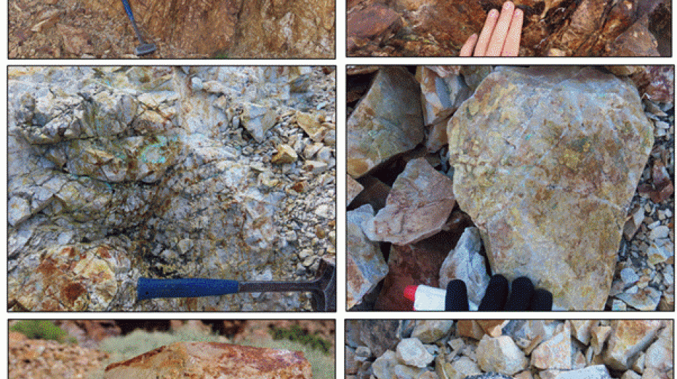 Figure 2. Examples of gossanous stockwork quartz-sulphide veins and secondary copper shows in QSP altered and silicified metasediments in the Porphyry South area.