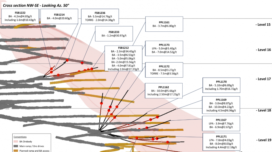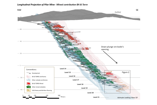 Figure 1 - Long Section showing the Pilar Mine underground layout and the position of the BA Zone relative to the other main orebodies. The location of the planned and ongoing BA Zone sub-level access development between level 15 and level 19 is highlighted at the bottom right corner of the figure.