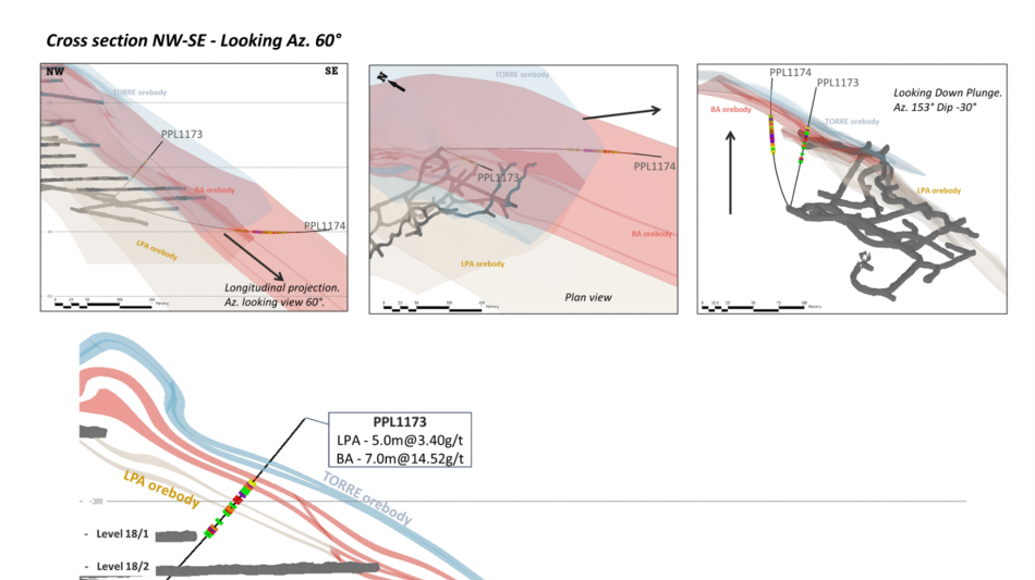 Figure 3 - Long sectional view highlighting the detail of drill holes PPL1173 and 1174, which confirm high grade continuity of the BA Zone over more than 250m.