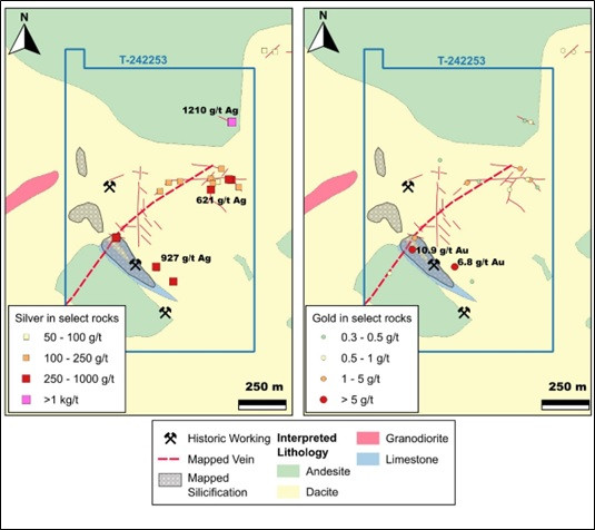 Mineralization on the Los Coyotes property has been mapped in multiple sub parallel northeast striking sub-vertical mineralized structures and as replacements within a limestone unit interbedded within the Andesites. The mineralized structures, which can be traced across the property for over five kilometres, are undrilled but contain several historical workings. Channel sampling of these structures at surface has returned up to 1.4 metres at 6.81 grams per tonne (g/t) gold and 927 g/t silver (Figure 2 and Photo 1).