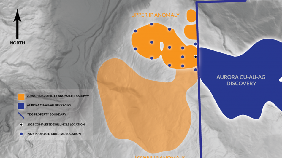 TDG has mobilized a second drill to site to accelerate drill testing of the newly developed exploration targets. These targets are defined by integrating geochemical and geological data, alteration mapping, structural analysis and geophysical targets generated from the ongoing 2025 Induced Polarization ("IP"), surveys. The second rig is expected to commence drilling by the end of the week. Both drill rigs will be operating in the vicinity of the TDG's AuWEST target which is located directly west of the 2024 Freeport-Amarc Aurora1 copper-gold-silver ("Cu-Au-Ag") discovery. Proposed drill locations will be results driven and are subject to change. (Figure 1).