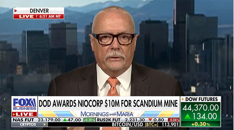 CENTENNIAL, CO / ACCESS Newswire / August 6, 2025 / In a live appearance today (https://www.foxbusiness.com/video/6376620692112) on the Fox Business News program "Mornings with Maria," host Maria Bartiromo asked Mark Smith, Chairman and CEO of NioCorp Developments Ltd. ("NioCorp" or the "Company") (NASDAQ:NB), about the possibility of America emerging as a global "scandium superpower" as a result of NioCorp's proposed Elk Creek Critical Minerals Project (the "Project") in southeast Nebraska.