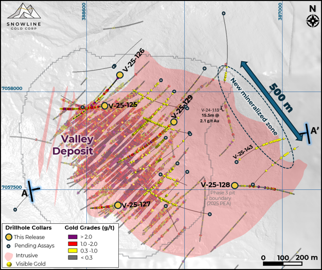 Figure 1 - Plan map of the Valley intrusion showing all drilling to date, including results from the first five holes received for 2025. Observations of visible gold in holes that have yet to receive analytical results are shown as yellow circles. The surface trace of Figure 2 is shown as A-A'. Note that 2025 holes are plotted above previous results for clarity, regardless of relative depths. The outline of the Valley intrusion corresponds to its expression at surface. See Snowline news release dated February 19, 2025 for further details on hole V-24-115.