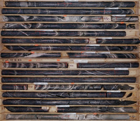 Figure 3 - V-25-143 drill core from 427.0 m to 443.5 m downhole. Light to intense sheeted quartz veins cut the Valley intrusion at multiple orientations, with varying alteration types around different veins. Similar mineralization occurs from roughly 326 to 443 m downhole, as well as in surrounding holes in an open, 500 m area along the eastern edge of the Valley intrusion which was previously assumed to be unmineralized. Vein thicknesses range from 5 mm to >5 cm. Minor bismuthinite and trace visible gold (denoted by orange flagging tape above the core) are present in the sheeted veins. Assays for this hole and others are pending.
