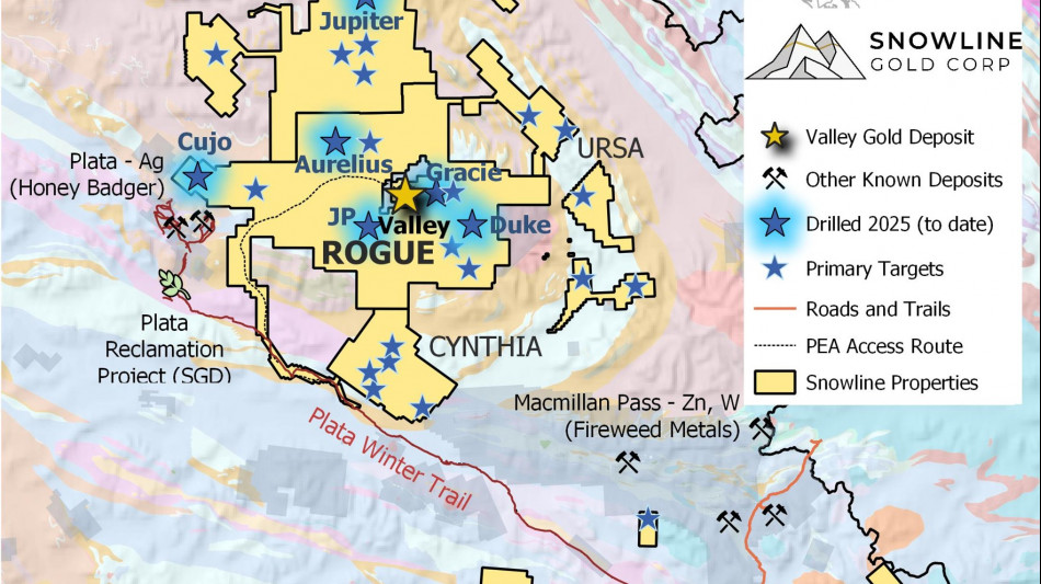 VANCOUVER, BC / ACCESS Newswire / August 7, 2025 / SNOWLINE GOLD CORP. (TSX-V: SGD) (US OTCQB: SNWGF) (the " Company " or " Snowline ") is pleased to provide updates to its ongoing exploration and development programs in the eastern Yukon. At Valley, sheeted quartz veins with visible gold are present in drill holes within a newly discovered and still open zone potentially 500 x 100+ m along the eastern boundary of the local intrusion (Figure 1), several hundred metres east of the current limit of the Valley Mineral Resource Estimate ("MRE") [1] (Figure 2). On the broader Rogue Project, of five additional reduced-intrusion related gold system ("RIRGS") targets drilled outside of Valley so far in 2025, all have now encountered trace instances of visible gold. Assays are pending for all regional holes. In addition, surface exploration has discovered sheeted quartz vein mineralization in granodiorite at Snowline's early stage "Ramsey" target, located at low elevations roughly 22 km west of Valley. To date, over 20,000 m have been drilled by the Company this year on the Rogue and Einarson projects, with drilling ongoing and assays pending for approximately 17,500 m.
