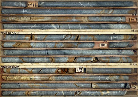 Figure 7 - AU-25-007 drill core from 103.8 m to 117.1 m downhole. Light to moderate sheeted quartz veins cut a granodiorite intrusion, with varying alteration types around different veins and selective oxidation. The hole is the first at Aurelius to intersect an intrusive stock and was cut short by technical issues. Assays for this hole and one other at Aurelius are pending, with plans for an additional hole to further test mineralization within this intrusion.