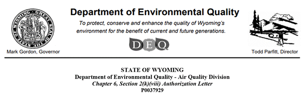 The Wyoming Department of Environmental Quality - Air Quality Division (AQD) has issued final authorization for the project under Chapter 6, Section 2(k)(viii), confirming that all air quality standards have been met. This authorization allows BYRG to proceed with the permitted operations upon final administrative payment.