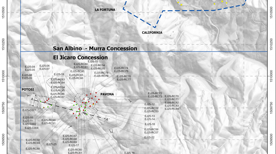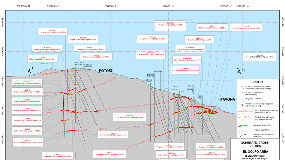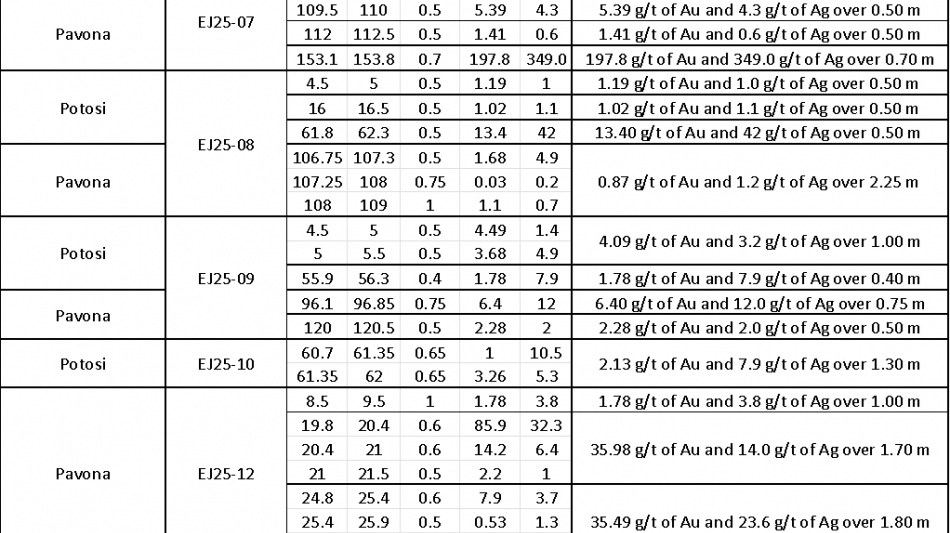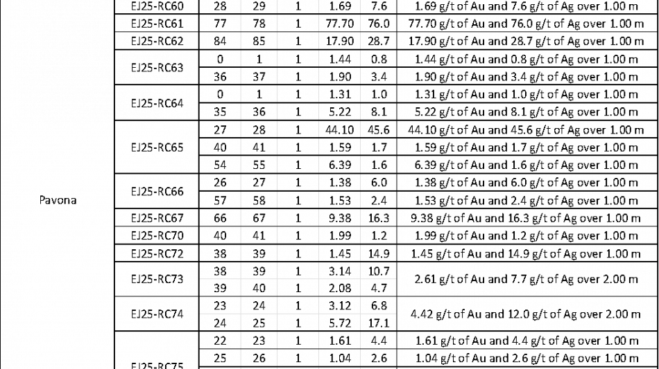 Drill hole EJ25-RC54 intersected a wide, high-grade interval (refer to Table 1) of 27.86 g/t Au and 2.1 g/t Ag over 4.0 m (ETW), 20 m below surface, and confirmed a 21.0 m down-dip extension of the gold mineralization intersected by RC drill hole EJ25-RC53 of 39.15 g/t Au and 27.8 g/t Ag over 8.0 m (5.9 m ETW), 19.2 m below surface (see Press Release dated May 21, 2025). Both drill holes tested a prominent NE-SW oriented structure interpreted as the Pavona vein.