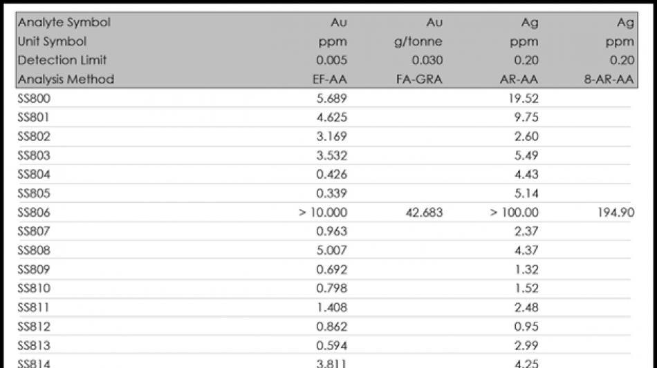 In total, 8 of 27 samples assayed above 5 g/t Au, including several high-grade results; multiple samples also returned notable silver values exceeding 190 g/t Ag.