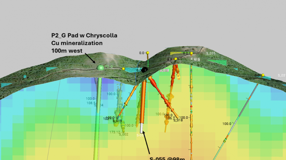 Geologically, Hole G is designed to pierce near-surface supergene copper mineralization where copper occurs as malachite and azurite along oxidized fractures, before stepping down into the hypogene domain where copper is hosted as chalcopyrite (cpy). The hole is set to cross a corridor of mineralized quartz monzodiorite (QMD) identified in Hole F (S-055), where recent drilling documented cpy as fine disseminations and within sheeted quartz-pyrite-chalcopyrite-K-feldspar veinlets, later quartz-calcite-chlorite-pyrite-cpy veins, and pyrite-cpy stringers. At depth (>300 m), Hole G aims to evaluate a hypogene Cu ± Au zone intersected in historical hole S-040, tying intrusive phases, potassic (potassium-feldspar) alteration, and structural corridors together across the south side of the Star Fault zone.